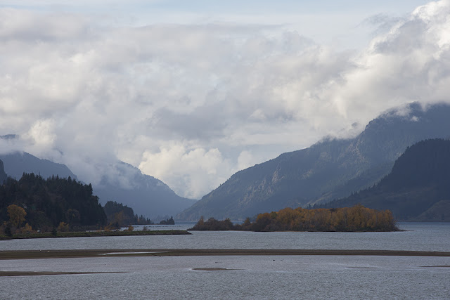 A rare view from the center of the Hood River-White Salmon Bridge crossing the Columbia. It's not so easy to get a photo from the bridge; it's a super narrow grated metal bridge with no pedestrian path. There is the possibility of a bridge lift, but I've never been lucky enough to get caught on the bridge when a large boat comes through. Today was my lucky day though. No lift, but intermittent bridge work was going on and I got stopped for a few minutes so I took the opportunity and got out to get a few photos. (Very odd feeling to be walking on the open grated bridge floor and looking through to the water below!)
